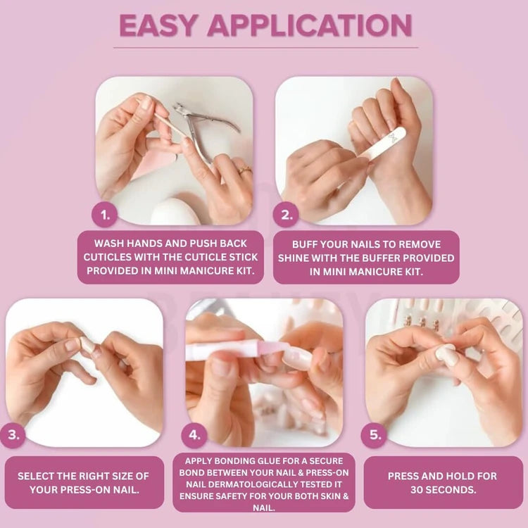 We provide a complete application kit with every Press Ons you buy. It includes Cuticle Pusher, Nail Glue, Glue tabs or adhesive tabs, and Filer/buffer.